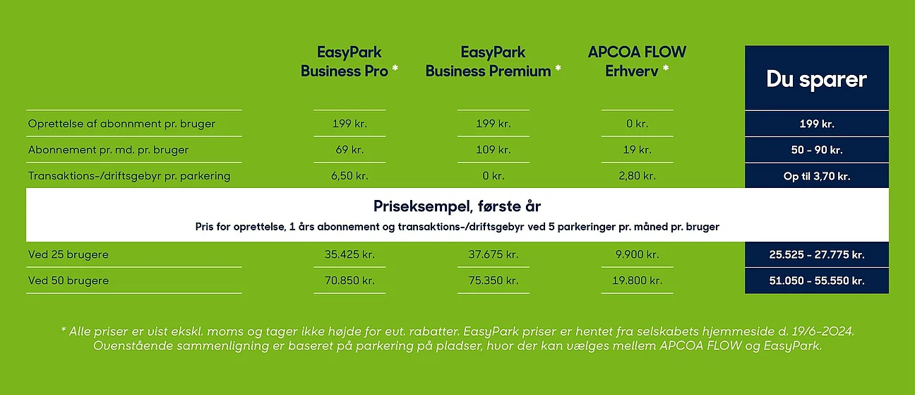 Prisen for at være APCOA FLOW Erhverv-medlem er markant lavere end gængse konkurrenters. Det koster kun 19 kr. eks. moms pr. mdr. pr. bruger, hvor andre udbydere tager helt op til 109 kr. eks. moms pr. mdr. pr. bruger. Vi har intet oprettelsesgebyr på brugere; andre erhvervsudbydere tager op til 199 kr. eks. moms pr. bruger.